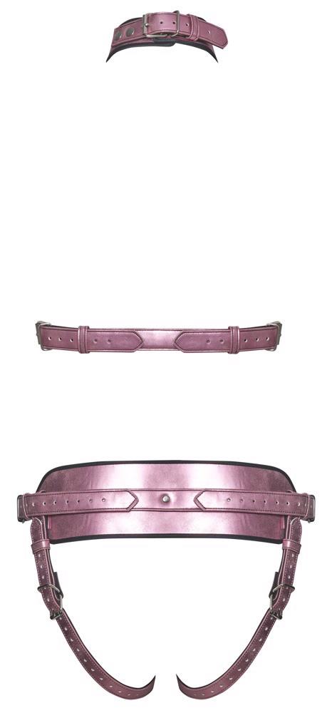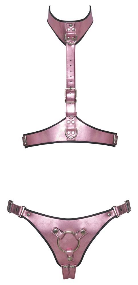 Ten zestaw uprzęży od Bad Kitty zawiera uprząż na klatkę piersiową oraz strap-on jock w metalicznym różanym odcieniu, z srebrnymi metalowymi detalami. Wnętrze zestawu wykończone jest czarnym, aksamitnie miękkim podszyciem z przyjemnym w dotyku wypełnieniem.