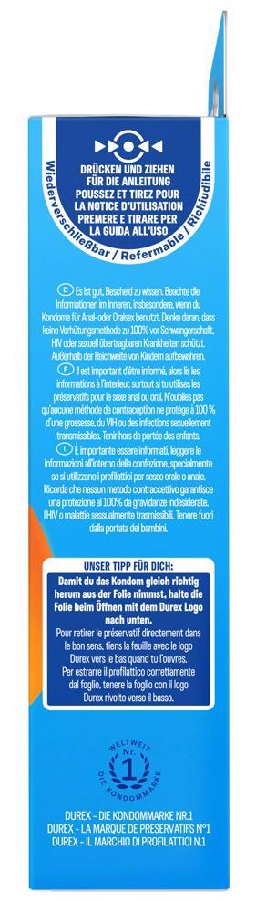 Przezroczysty, anatomiczny kształt prezerwatywy z łatwym dopasowaniem dla idealnego dopasowania i łatwiejszego rozwijania. Specjalny proces produkcyjny nadaje również przyjemny zapach. Bardzo wilgotny ze zbiornikiem. Testowany dermatologicznie.