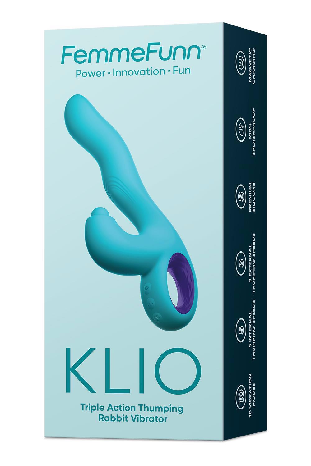 Triple Action Rabbit Vibrator and G Spot ToyHop to it already! The ride of your life awaits in the form of Klio, our supremely durable, yet flexible triple action thumping rabbit vibrator that is made to adjust to YOUR body type.5 internal thumping speeds, and 10 internal vibration modes, along with 3 external thumping speeds trigger a triple action intensity that will blow your mind. Play with them separately or together – the orgasmic options are endless.An insertable curved tip mimics the shape of a finger and has an insertable length of 5 inches, making it the perfect A spot and G spot toy. Perfect for exploration, an ergonomic handle ensures your playtime is as comfortable as fun.Klio is made from our signature SOFTFEEL™ silicone, which means it’s not only super soft but also waterproof, so you can get as wet n’ wild as you please.Length: 8.4 inches / 21,3 cmWidth: 1.3 inches / 3,3 cmInsertable Length: 5 inches / 12,7 cmTriple action thumping rabbit vibrator5 Internal thumping speeds10 Internal vibration modes3 External thumping speedsErgonomic handleWaterproofMaterial: Premium Silicone, ABSBattery: Li-ionCharging Voltage: 5VRun Time: Approx. 1 Hour at Highest Setting*Charge Time: Approx. 2.5 Hours**Charging and use times are estimates only. Battery life varies over time, and all batteries experience a decline in useful life over time.