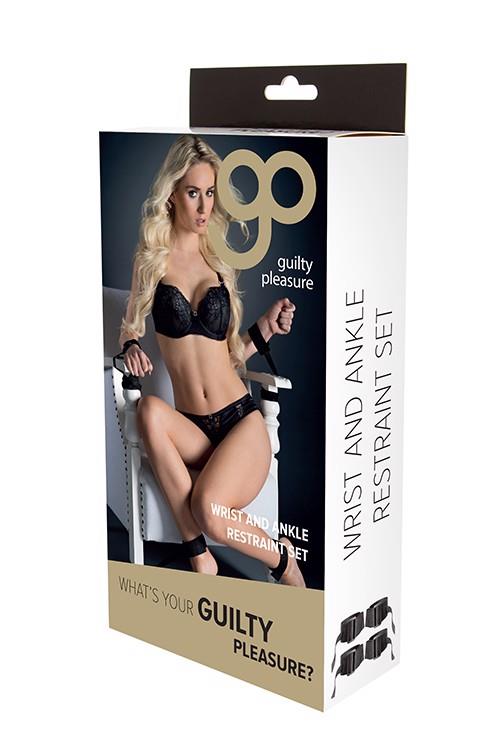 Set of buckled writs and ankle restraints from the Guilty Pleasure BDSM collection.Made of nylon with plastic buckles.The cuffs are closed with Velcro.The straps are adjustable in length.