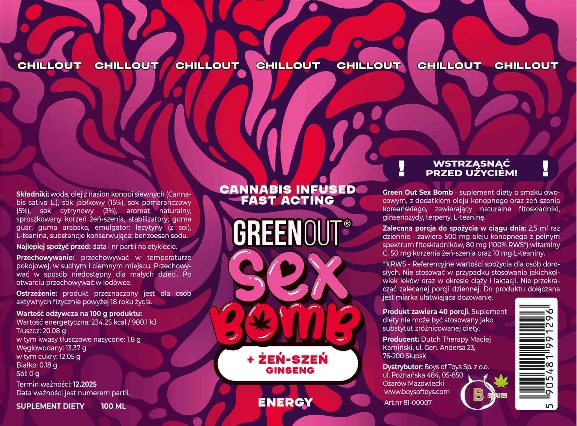 Green Out „Sex Bomb” to suplement konopny o przyśpieszonym oraz poszerzonym działaniu, zawierający naturalne fitokanabinoidy, flawonoidy oraz profil terpenowy odmiany Zkittlez od Jungle Boys wraz z dodatkiem Ginseng Żeń-Szeń!