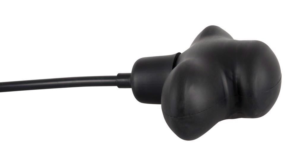 Nadmuchiwany knebel z pompą kulową. Około 12 x 5,5 cm wielkości. Czarny. Materiał knebelkowy: silikon. Kula pompy materiałowej: Lateks, wykonana z naturalnej gumy lateksowej, która może powodować alergie.