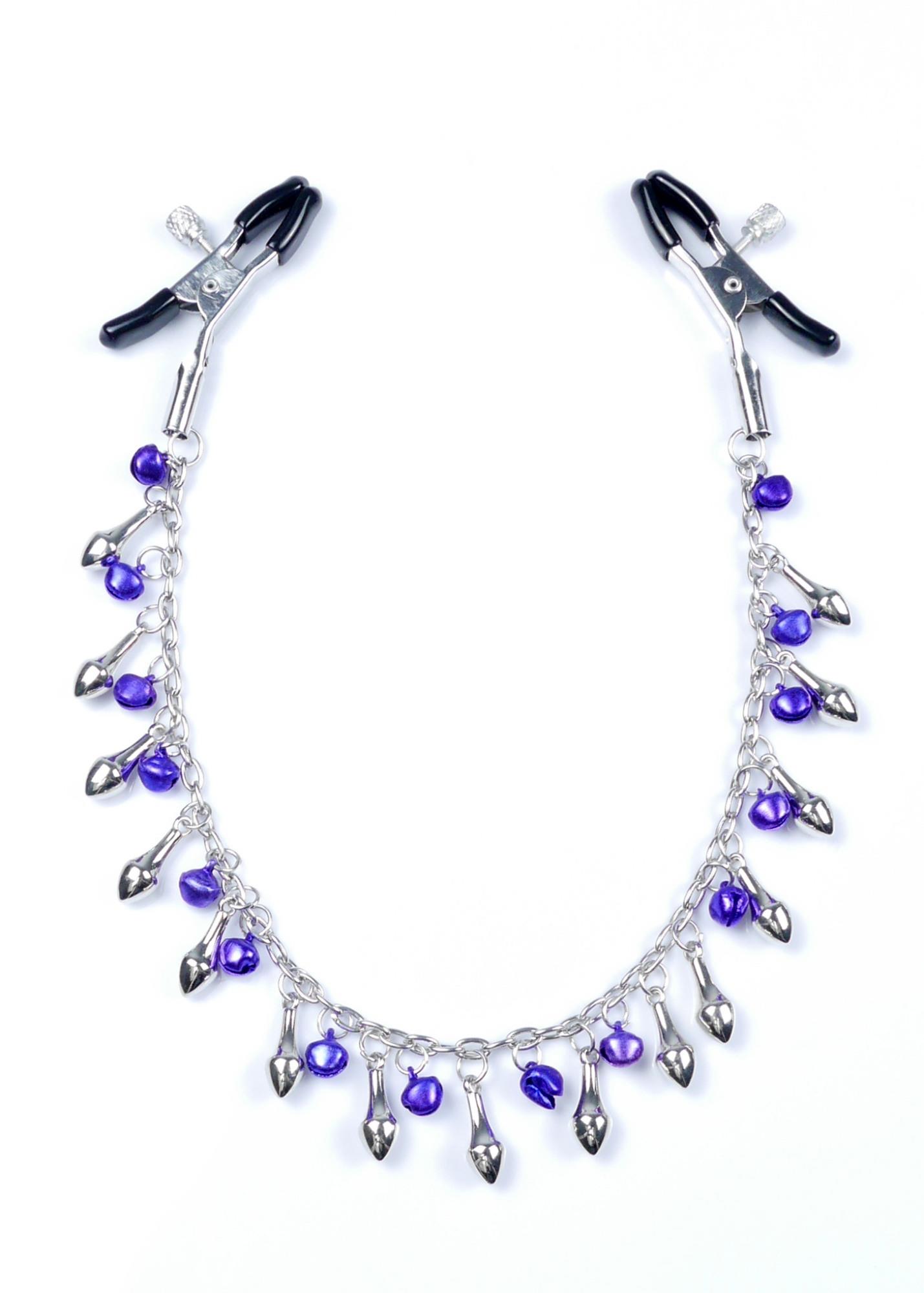 Wytrzymałe metalowe zaciski pokryte miękką gumą, te zaciski są idealne dla początkujących jak i entuzjastów. Siłę zacisku brodawki można regulować obracając śrubę, Elegancki łańcuszek z małymi dzwoneczkami oraz zdobieniami łączy oba sutki, daje to niesamowitą stymulację przy każdym ruchu.